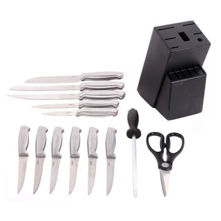 Prep for a large dinner party or serve steak for six with this Oceanstar 15-piece knife set, stored in a convenient solid-wood block. This set includes the versatile chopping tools you need for every meal, including a seven-inch Santoku knife, an eight-inch chef's knife and a pair of kitchen shears. A set of six steak knives ensures that your guests have what they need to enjoy your best ribeye steaks. The triple-riveted handles hold up to daily use, and the ergonomic design provides a comfortable grip.- Blade material: Stainless Steel