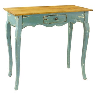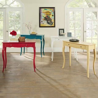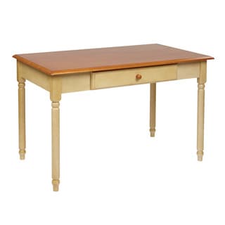Display a few favorite family photos and perhaps a piece of beautiful pottery on this welcoming foyer table. You can dress up your entryway with this useful table in a buttermilk and cherry wood veneer finish. The finely-crafted, rounded details on the legs add to the table's country feel.The size of this table is perfect for storing items that you need on your way in and out of the house. It's a good spot for house keys, a phone-charging station and a bowl for the day's mail. Keep magazines on the cherry-toned shelf and an extra pair of gloves in the handy drawer.
