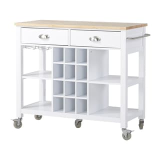 The Salem white kitchen island is necessary staple for any kitchen. With the white finish, silver knobs, and conventional lines it is a signature piece. It features 12 bottle wine racks, wine glass holders, towel rack on one side, two (2) drawers on the front, collapsible shelf for more counter space if needed, two (2) cabinets, and a closed spice rack.| Caractéristiques | |