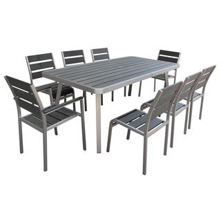 Enhance your outdoor living space with this nine-piece slatted dining group from Panama Jack. With plenty of room for you and seven guests, this furniture ensemble makes casual entertaining both easy and comfortable. Use this ensemble to dine alfresco on warm summer nights by your pool or in your backyard.Made from extruded aluminum and supported by sturdy legs, this seating group is strong and stable, ensuring it serves you well through many good times. The finish is powder coated for weather resistance and UV protection, helping to preserve the lovely espresso color through all types of weather.