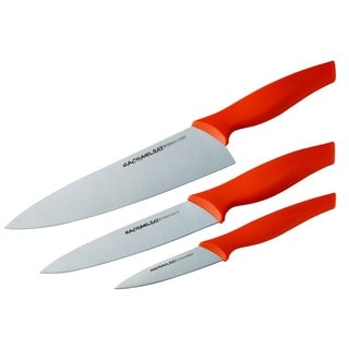 Cutting veggies and meats is a breeze with the Rachael Ray Cutlery 7-inch Japanese Stainless Steel Santoku Knife with Orange Handle and Sheath. Much like a chef's knife but with a straighter blade, this santoku knife is great for cutting carrots and zucchini into matchsticks to saute with garlic, or for slicing boneless chicken breasts for Rachael's yummy Chicken Club Cutlet Stacks. This sturdy knife is crafted from top-quality, easy-clean Japanese steel for super-sharp and long-lasting cutting performance. And a plastic protective sheath helps to preserve the blade's sharp edge when not in use. This colorful santoku knife complements many other items in the vibrant Rachael Ray collections.- Blade Material: Japanese stainless steel