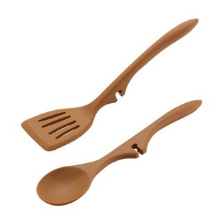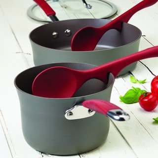 This 2-piece tool set from Rachael Ray includes a lazy spoon and a lazy ladle. Featuring grooves in the handles and high-heat silicone heads, these vibrant tools can be conveniently rested on the edge of the pot.- Brand: Rachael Ray