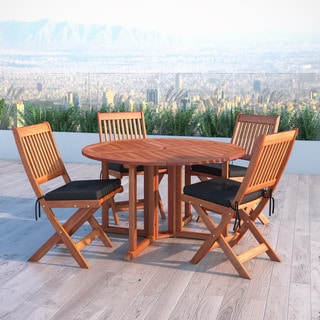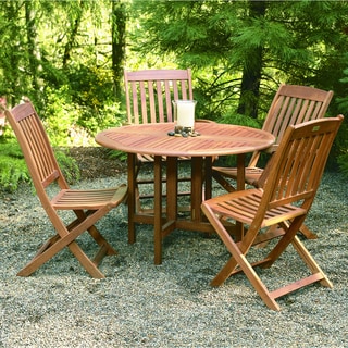 This set includes a folding table and 4 comfortable folding chairs. The sides of the table fold down, and the four folding chairs easily stow underneath the table, for simple storage when the set is not in use. Wheels on two table legs allow the folded set to be easily transported out of the way for storage. The storage feature keeps chairs out of the way when not in use while protecting them from damage. The umbrella hole in the table center allows for a standard-size umbrella to be added for shade. This set is made of Acacia hardwood with oil-based stain. Minimal assembly is required; hardware and easy-to-follow assembly instructions are included.