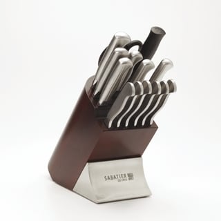 This Sabatier 15-Piece Cutlery Set with Concave Acacia Block keeps essential everyday knives at your fingertips. The knives are expertly crafted from superior quality high-carbon stainless steel and feature triple riveted handles that are perfectly weighted and balanced for control. The round acacia storage block keeps knives organizes while adding elegance to your kitchen counter.- 15-piece set includes: