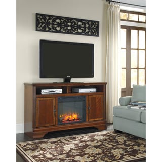 Enhance your living room experience with the Porter TV stand from Signature Design. In a rustic brown color, this console includes a bronze colored knob and backplate, lighted piers, and adjustable shelves.- Set includes: One (1) TV stand, one (1) fireplace insert