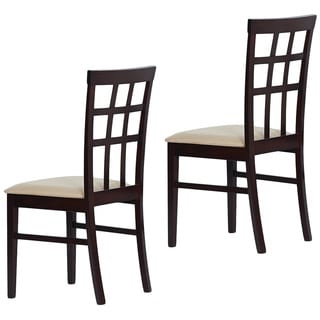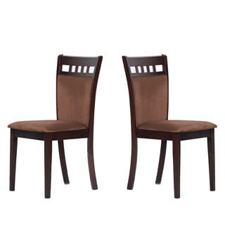 This set of four modern dining chairs provides a simple, yet attractive and contemporary upgrade to your dining room set. Match these sturdy dining chairs to a dining room table and enjoy the comfort of their foam fill and microfiber fabric upholstery while you dine with friends and loved ones. The black and espresso finish provides a quietly natural, yet handsome aesthetic around the table.