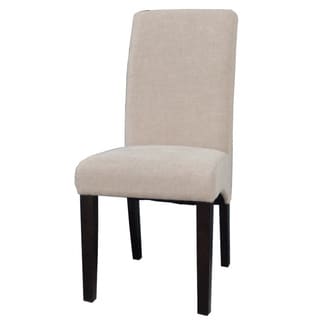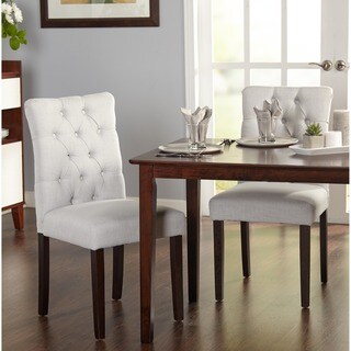 Amplify the elegance of your dining room with this set of two Simple Living Vinnie parsons chairs. Versatile in use and classic in style, these chairs feature stitching on the durable linen fabric upholstery for added strength and visual interest from every angle. The tall chair backs provide plenty of support which makes them a comfortable choice at your dining table, in your living room or along a wall in your entertainment area when extra seating this needed. Espresso-finished and hardy, eco-friendly rubberwood legs provide support, and stuffed foam seats with coil spring construction add durability and long-lasting beauty.- Set of two (2) chairs in a choice of navy polyester, beige linen fabric, off white with grey print linen mix fabric upholstery and foam filling