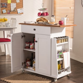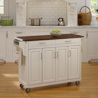 Give yourself an extra storage space with this charming Country Cottage Kitchen Cart. Set on rolling casters for easy transportation, this rustic cart provides an ample work space as well as a spice rack, knife block and towel bar. Two of the four casters on this storage unit are self-locking, so you do not have to worry about the cart wandering from its place. This cart is constructed with durable rubber wood to provide longevity. With one shelf, four drawers and two concealed cabinets, this useful cart provides plenty of storage options. The cart's attractive white finish fits well with numerous kitchen motifs.- Four (4) casters, two (2) self-locking