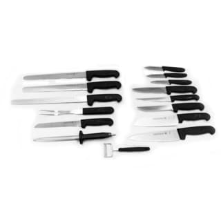 Materials: Stainless Steel and Polypropylene Care instructions: Hand wash recommended Finish: Stainless Steel Finish Dimensions: Case: 17.5in x 12.3in x 2.9in (1) Cleaver Knife- Blade: 6.3in/ Handle: 5.4in (6) Steak Knives- Blade: 4.2in/ Handle: 4.3in (6) Steak Fork- Fork- 4in/ Handle: 4in (1) All Purpose Scissors- 8.4in (L) (1) Chicken Scissors- 9in (L) (1) Knife Sharpener- 11.4in (L) (1) Ham Knife- Blade: 9.5in/ Handle: 5.4in (1) Bread Knife- Blade: 7.9in/ Handle: 5.3in (1) Carving Knife- Blade: 7in/ Handle: 5.3in (1) Meat Fork- Fork: 6.3in/ Handle: 4.7in (1) Cheese Knife- Blade: 4.9in/ Handle: 4.3in (1) Pizza Knife- Blade: 4.3in/ Handle: 4in Oven safe: No- Handle Material: Polypropylene