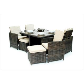 Add functionality and comfort to your outdoor space with this nine-piece dining set. Constructed with powder-coated aluminum and finished with UV protected wicker, this set is resistant to scratches and fading. The thick cushions are upholstered with polyester fabric, providing comfort and repelling water and moisture while remaining easy to clean.- Espresso-toned wicker brings rustic beauty to any outdoor space