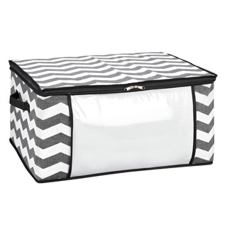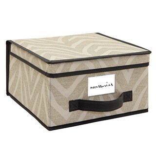 Wide enough to fit a hat and deep enough to fit bulky items, this box lets you organize your closet with style. The black-and-white design is versatile enough to work as a neutral color or as a distinctive touch to a bland area. The black cloth handle lets you easily grasp the box on a high shelf.