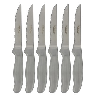 This Top Chef five inch steak knife set will have you cutting like the pros. Like those used on Bravo's top-rated Top Chef program, this knife set features an ice-tempered stainless steel blade with precision cut sharpened cutting edge, hollow ground to reduce sticking and a full steel handle with seamless bonded and polished bolsters.| Caractéristiques | |