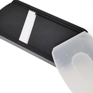 V-shaped blades allow for cleaner slices and easily cut through softer foods. The Mandoline Vegetable Slicer includes 5 interchangeable plates for slicing, shredding and grating - V-slicer, V-wavy slicer, Fine Shredder, Coarse shredder, Grater. Includes blade box to safely and neatly store blade plates. Installed .25-inch and .35-inch julienne blades - expose blades with rotating knob. Adjustable thickness from paper thin to 0.25 inches. Features sturdy, non-slip, foldable base for easy use on tables or containers. Comes with ergonomically designed, universal food pusher.Specs
