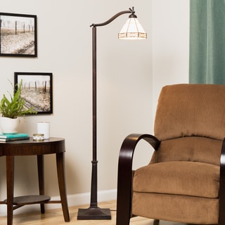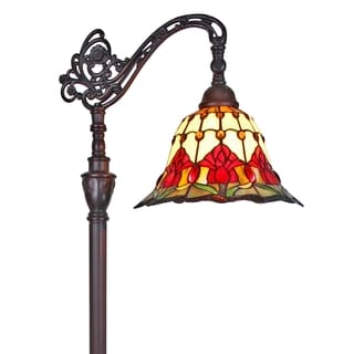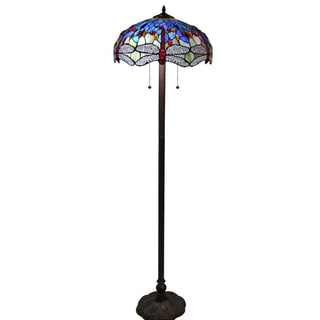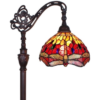 Brighten a dark corner with this dragonfly reading lamp from Warehouse of Tiffany. It uses one 60-watt bulb to produce a soft, cozy glow in a reading nook or living area. Operating this floor lamp is easy, even when your hands are full - simply step on the foot switch to turn the light on or off.Crafted with a glass shade in classic Tiffany style, this dragonfly lamp adds a vibrant pop of color to your decor. The tall metal stand features decorative detailing and an antique-inspired scrolling arm, which blend in to a traditional or vintage-style home.