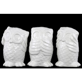 antiqued finish, these ceramic owls strike the poses of Hear No Evil, Speak No