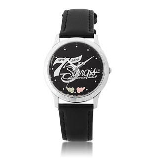Designed with a yellow goldtone case this 75th anniversary watch for the Sturgis Motorcycle Rally is a unique item. Finished with a black leather strap and matching dial, the timepiece is powered by a Japanese quartz.| Caractéristiques | |