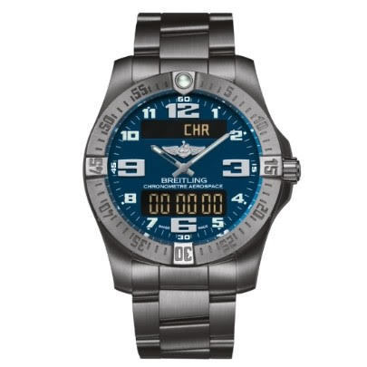 The Breitling Chronometre Aerospace watch features a unidirectional bezel and brilliant blue dial with luminous hands and arabic numeral hour markers. Scratch resistant sapphire crystal over a quartz movement operated with a screw down crown. Measuring 43 mm this luxury style timpiece is held together with a fold over clasp on an adjustable bracelet. All measurements are approximate and may vary slightly from the listed dimensions.br>| Caractéristiques | |