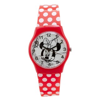 Show off fun style in this Minnie Mouse watch from Disney. This stylish watch highlights a dainty round face with a Minnie Mouse decal on the dial. A croc-print PU leather strap secures with a tang buckle to complete the design.- Case: Metal, round