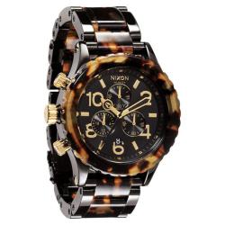 This Nixon watch is styled in a dark tortoise shell pattern with goldtone markers and hands on a black dial. The bracelet of this watch is constructed of metal and acetate and finished with a safety deployment clasp.- Case: Stainless Steel