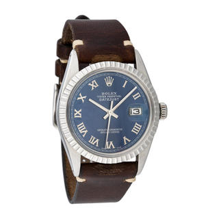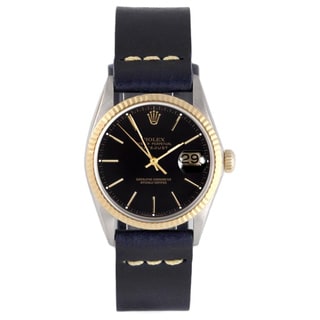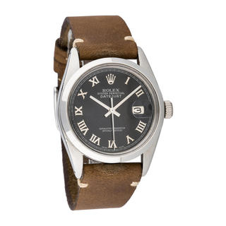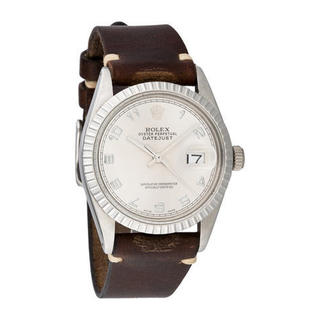 This classy men's pre-owned Rolex Datejust watch features a stainless steel case with a yellow gold fluted bezel and brand new brown leather strap. The combination of the specifications gives this vintage timepiece a modern fashion.