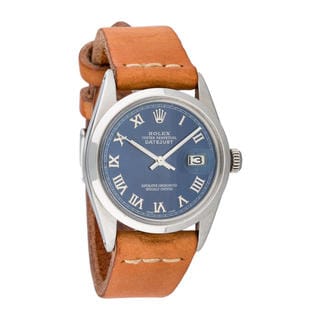 SalePre-owned Rolex Mens Stainless Steel Leather Datejust Blue Roman Dial Watch