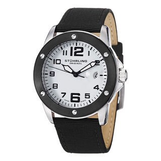 This Stuhrling Original men's timepiece is attractive and sporty. The watch features a chronograph 24 hour and 60 minute counter. A date window features at 6 o'clock. The canvas strap makes this a comfortable and stylish timepiece.| Caractéristiques | |