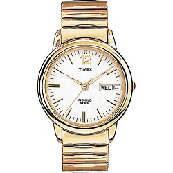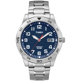 Fashionable for any occasion, the Timex silvertone stainless steel watch features an easily readable dial with full Arabic numeral display against a classic white dial background. It offers a full-sized, round watch case with slightly raised bezel and an expansion bracelet composed of stainless steel links. It also features water resistance to 99 feet (30 meters), a 10-year battery life, and date display at 3 o'clock. With the Quick Date function, you can set the date on the watch without turning the crown for every 24-hour period. Just pull the stem halfway out, and turn until desired date is reached. The Indiglo® night-light uniformly lights the surface of the watch dial using patented blue electroluminescent lighting technology. It uses less battery power than most other watch illumination systems, enabling your watch battery to last longer.- Case: Brass, silver-tone, round