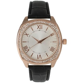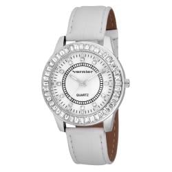 The beautiful V11011 features baguette crystal stones in the bezel and crystal stone markers for a classy, all-purpose finish. The bezel crystal stones sparkle against the silvertone case, and the white strap makes it easy to match any outfit. The watch arrives in a Vernier gift box.