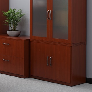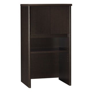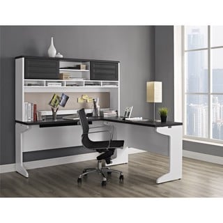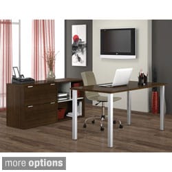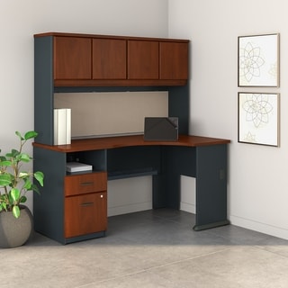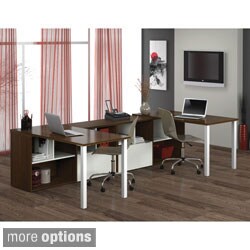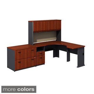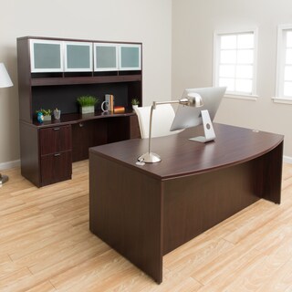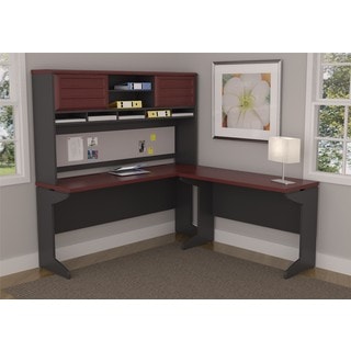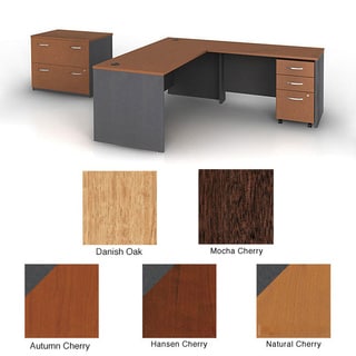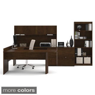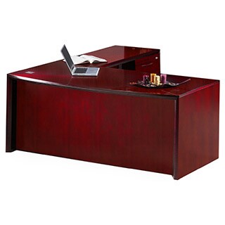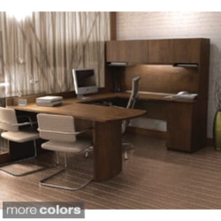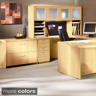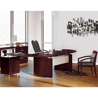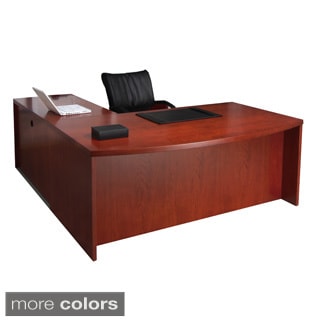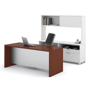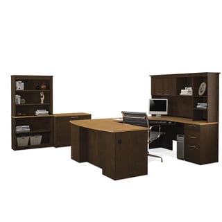 The Pursuit U-Shaped Desk with Hutch Bundle is a great solution for work or home. This commercial-grade four piece set includes the Pursuit Executive Desk, Hutch, Credenza and Bridge Table. Together, the four pieces connect to form a U-shaped office solution with a generous amount of workspace and storage options. The executive desk, bridge and credenza each have wire management slots on the sides, allowing you to keep wires neat and organized. The hutch is perfect for keeping documents and projects neatly stored in the open and concealed cubbies. The warm cherry and dark grey finishes complement each other for a sophisticated look. The Pursuit U-Shaped Desk with Hutch Bundle requires assembly upon delivery and ships in four boxes.