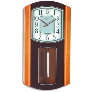 This Bedford Clock Collection handsome wall clock features a weathered cherry finish. Flat top, distinctive columns with corbels framing the door and carved moldings that accentuate the pediment. Circular spun antique polished dial with black Roman numerals, hour markers and hands. An antique polished brass inspired pendulum with grid hangs below. A melodic hourly chime adds to the charm of this distinctive wall clock which is sure to be a lovely addition to your home or office. Has 4 chime modes and volume control toggle. Clockwork and Pendulum run on a standard 'AA' battery (not included), Weathered cherry oak finish and clear hinge door case allows unobstructed viewing of the gently swaying pendulum, 4 chime modes, Volume toggle, Polished Black dial with chapter ring accents, Wooden case has a traditional hanging style pediment, Dial features Roman numerals, Polished brass inspired pendulum bob- Material: Wood, Brass, Glass