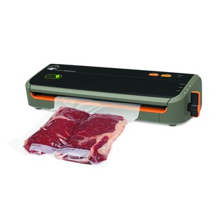 Keep meats, poultry and fish fresh up to 5X longer with the FoodSaverGameSaverBronze vacuum sealing system designed with OFFICIAL Mossy OakBreak-UpInfinity Camo Pattern. It vertically flips up for counter-friendly storage and features hands-free operation with an easy lock latch. The built-in roll storage and cutter allow you to make your own custom length bags while the two seal levels and two vacuum speeds give you control for all of your vacuum sealing jobs. It features: Easy, touchpad controls; Patented, removable, dishwasher-safe drip tray; Extra-wide sealing strip creates secure, air-tight seal; Convenient, built-in roll storage and cutter; Moist/Dry food settings for optimal sealing; Accessory Port and hose vacuum seals canisters and marinates food in minutes. Includes 2 rolls and 10 pre-cut bags.- Built-in roll storage and cutter