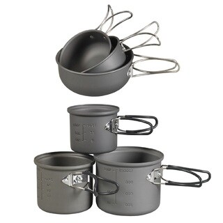 This 4-Person Hard-Anodized Aluminum Cook Set from Stansport has a precision nested design to save space. The hard anodized, non-stick aluminum is twice as hard as steel. Convenient folding handle for storage. Quick heat transfer saves time and fuel.| Caractéristiques | |