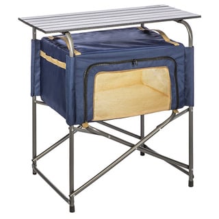 Pleased With Purchase I've spent a lot of time looking for something compact but useful for both a small table and for kitchen storage while camping. The Portable Serving Station is perfect for both. It folds up like a camp chair, yet it is also a tall, sturdy table when set up. The carry bag is about the size of a large tent and only a little heavier. The table top is the perfect height, and the unit is remarkably stable when unfolded and placed on an even surface. I gave four out of five stars because you can get a larger camp kitchen elsewhere for less money.