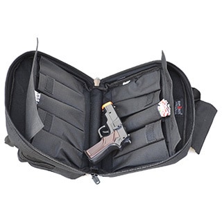 Attache Gun Case is made ith 600 Denier water resistant polyester. Contain a padded interior gun pocket and elastic bands to accommodate five pistol magazines. -Black (13.5 inches wide x 9 inches high).| Caractéristiques | |