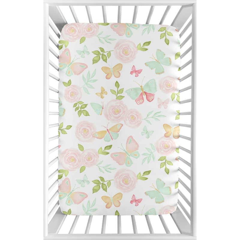 Sweet Jojo Designs Blush Pink, Mint, White Watercolor Rose Butterfly Floral Collection Fitted Mini Portable Crib Sheet
