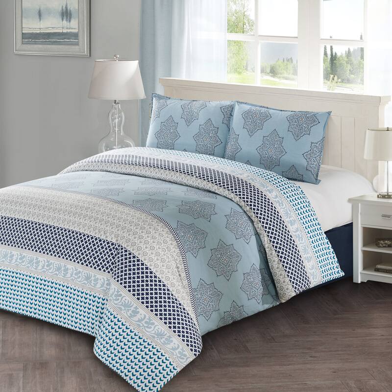 A stripe design made up of different patterns provides vibrant and cheerful look to your bedroom. The palette is made up of grey, light blue, dark blue and aqua blue colours. This 3-piece 100% cotton duvet cover set includes a duvet cover (104" x 90") and pillow shams (20" x 36"). Machine wash, cold water on gentle cycle. Tumble dry on lowest heat. Do not bleach.