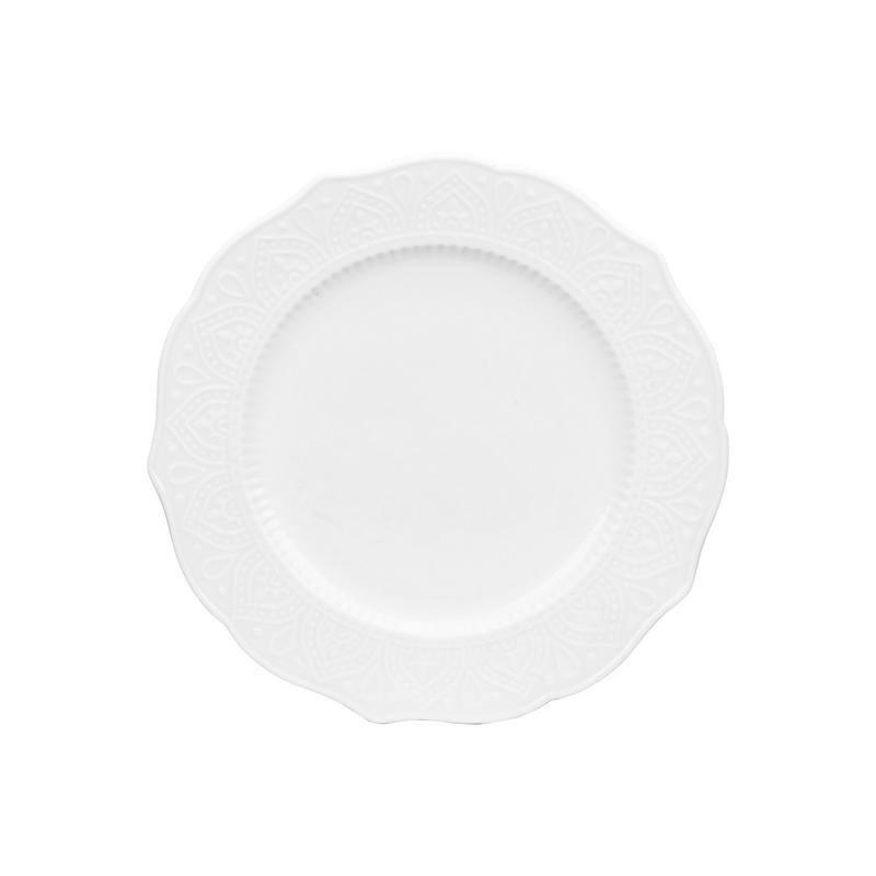 Graceful and elegant, the Dahlia collection adds sophistication to any table setting. With an embossed pattern and beautiful scalloped edges, this porcelain dinnerware transitions perfectly from everyday use to special occasion. Set of six 7.75" side plates. While dishes are microwave-safe, they may become hot. Handle carefully.
