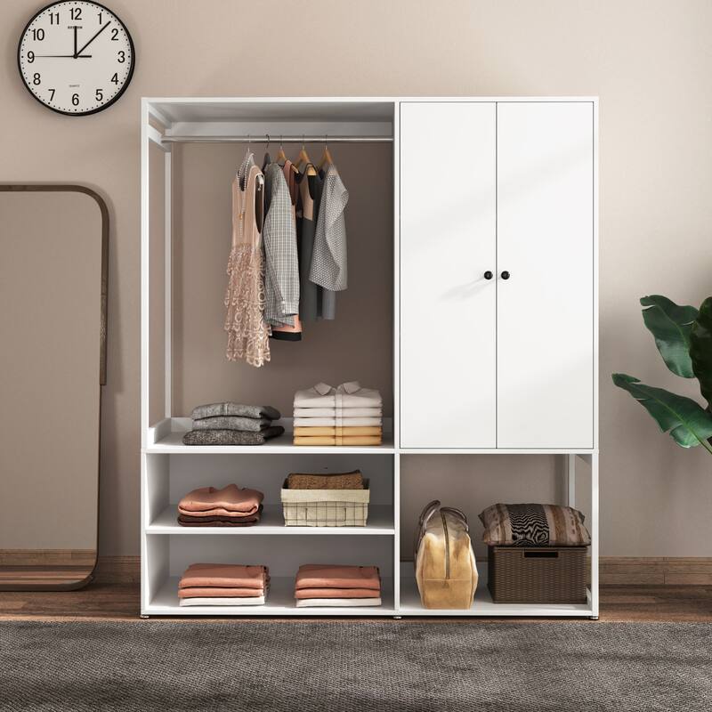 - This white armoire wardrobe features a hanging rod, two doors, and multiple interior shelves, offering generous storage space for clothes, accessories, and everyday items. Perfect for bedrooms, laundry rooms, or entryways, it keeps your space tidy and organized.