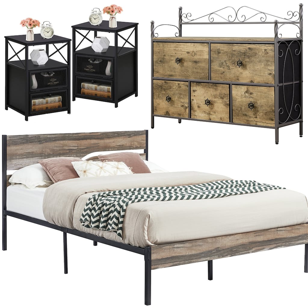 3 Piece Bedroom Set, 14.2-Inch Metal Bed Frame with Nightstand set of 2