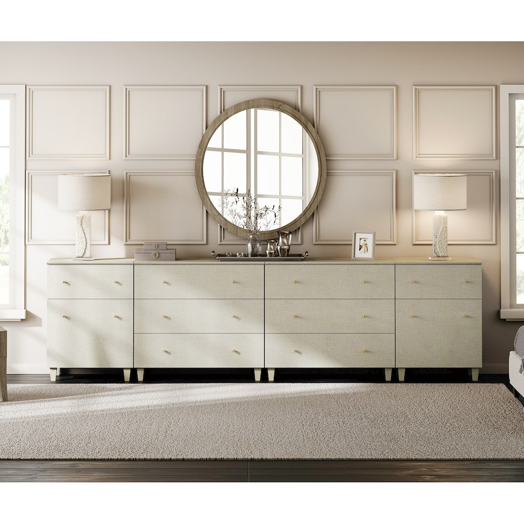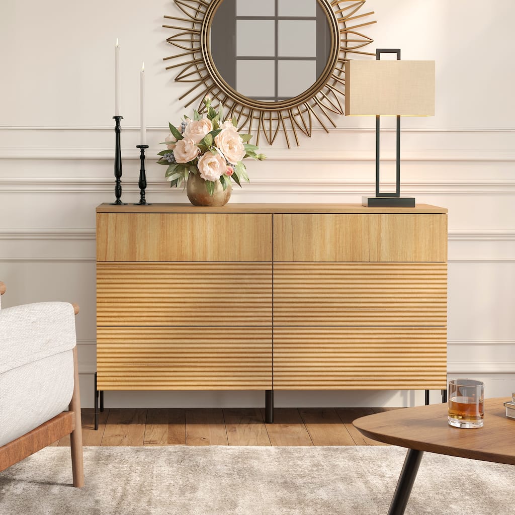 3-In-1 wide dresser features 6 large drawers each of which measures 20.9" L x 11.3" W x 5.9" H and 2 smaller drawers which measure 20.4" L x 11.3" W x 3.3" H, 4 adjustable storage compartments for different size items and organize your clothes, blankets, etc. As well as the 94.4"x15.4" wide tabletop is perfect for displaying lamps, books, etc. The bedroom dresser maximizes the vertical storage space while keeping your daily essentials and display decorations in order.