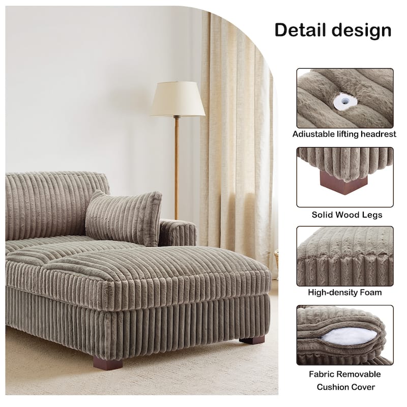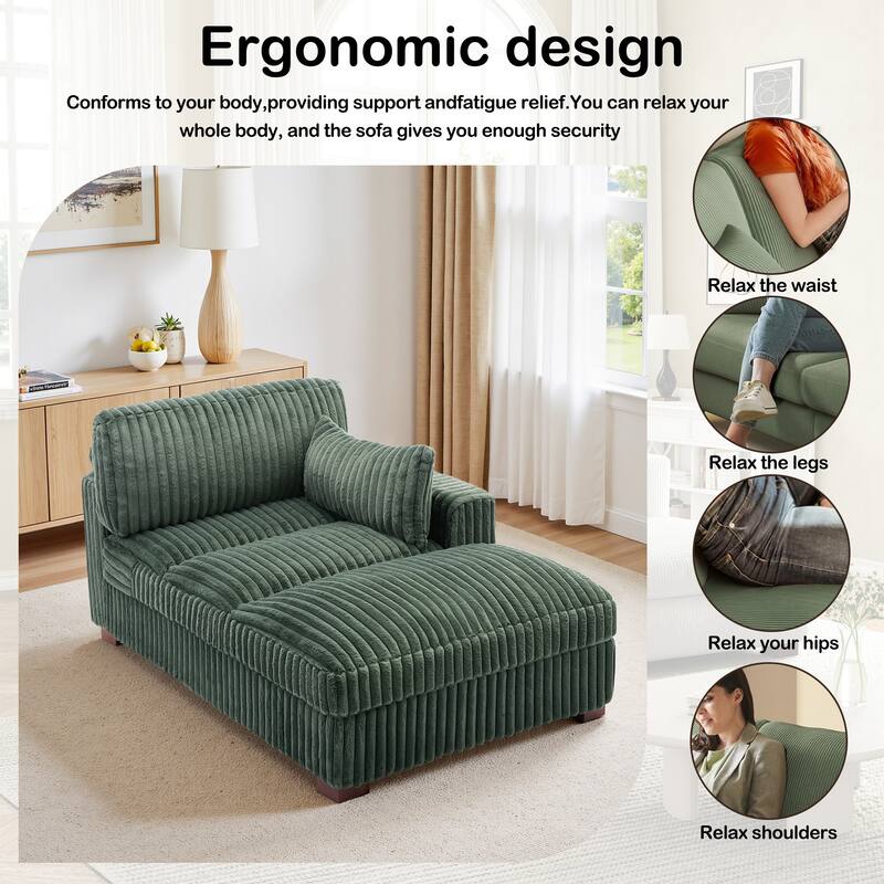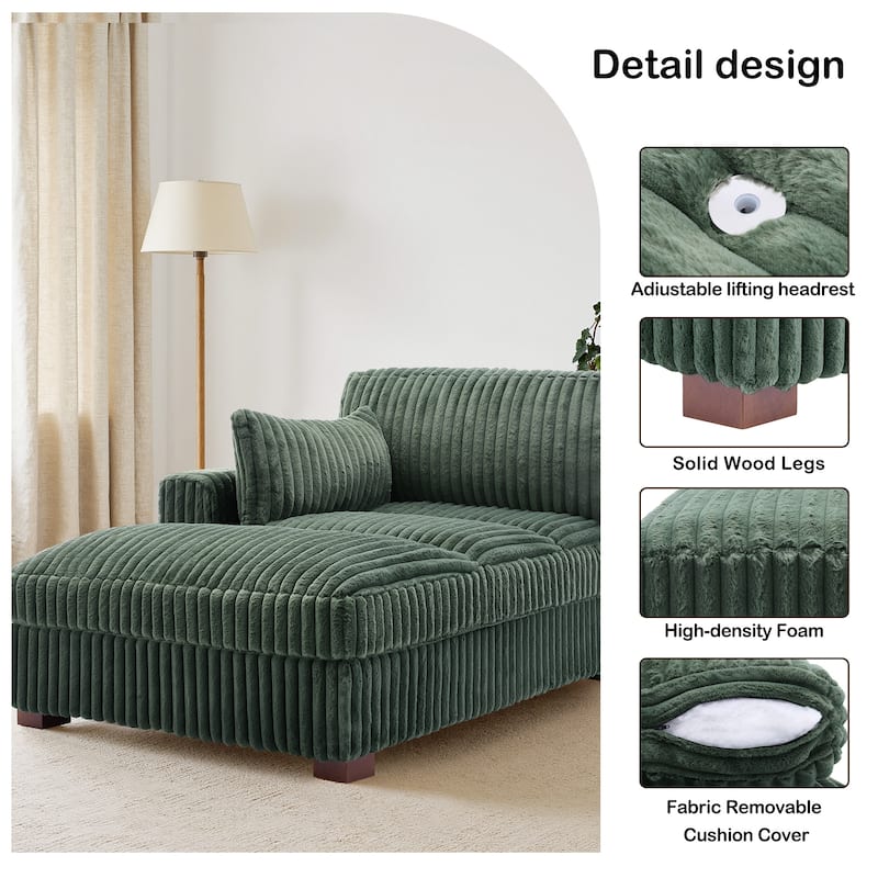 Sink into effortless comfort with this plush corduroy chaise lounge. Upholstered in soft, textured plush corduroy, it features square armrests, a generously cushioned seat, and supportive foam filling for all-day relaxation. The built-in spring system enhances your lounging experience with balanced support. Sturdy wooden legs offer durable stability, while the included side pillow adds an extra cozy touch. Perfect for reading, napping, or simply stretching out, this chaise brings easygoing style and comfort to any space.