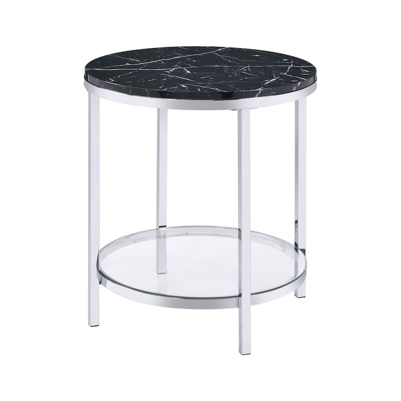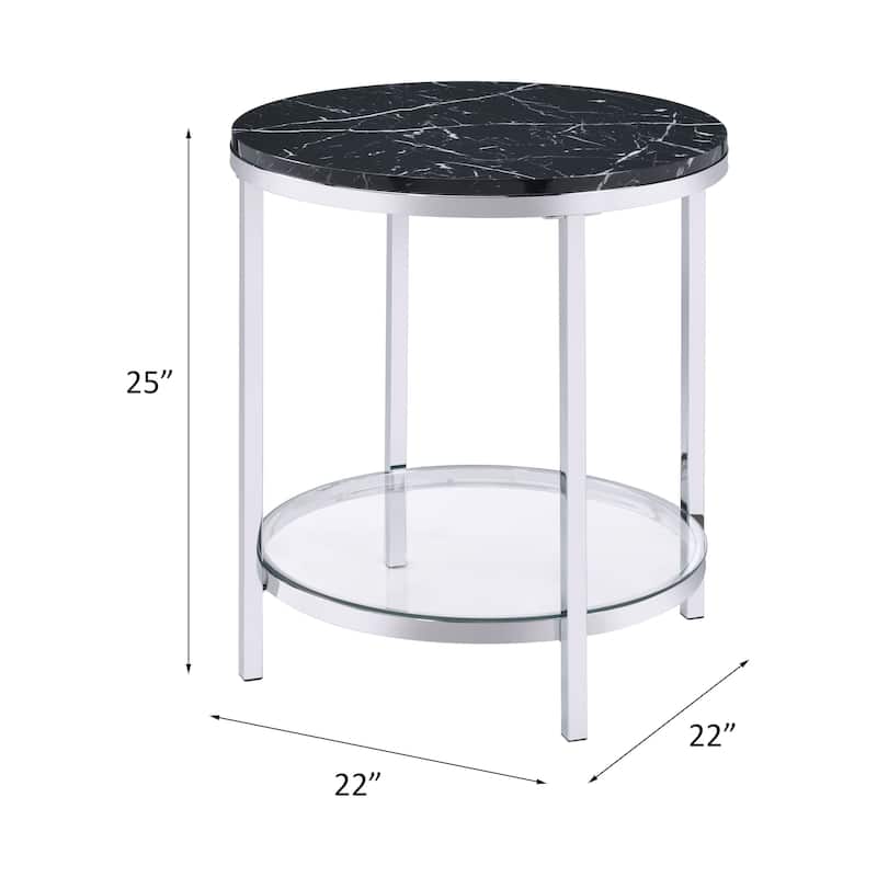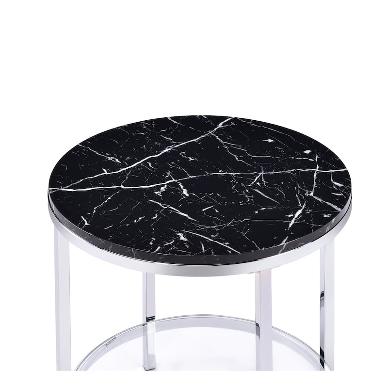 The ACME Virlana End Table is a stylish and modern piece of furniture that will enhance the look of any living room, bedroom, or home office. The table features a faux black marble top that provides an elegant and sophisticated touch, while the chrome-finished metal frame adds a sleek and contemporary look. The table measures 24 inches in height, making it the perfect height to sit beside a sofa or armchair. The top of the table measures 24 inches in diameter, providing ample space for a lamp, books, drinks, or any other decorative items. The faux marble finish gives the top a luxurious look, while the chrome finish of the frame adds a touch of shine and modernity.