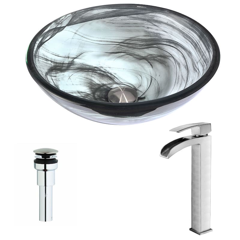 Add sophisticated style to your home with this ANZZI Mezzo Series vessel sink with a Key faucet in brushed nickel. This beautiful top-mount sink features a RHINO ALLOY certified tempered deco-glass construction with a slumber wisp finish for style and durability. This low-maintenance sink is easy to clean and has a scratch-tough and stain-resistant non-porous surface to keep it looking great for years.