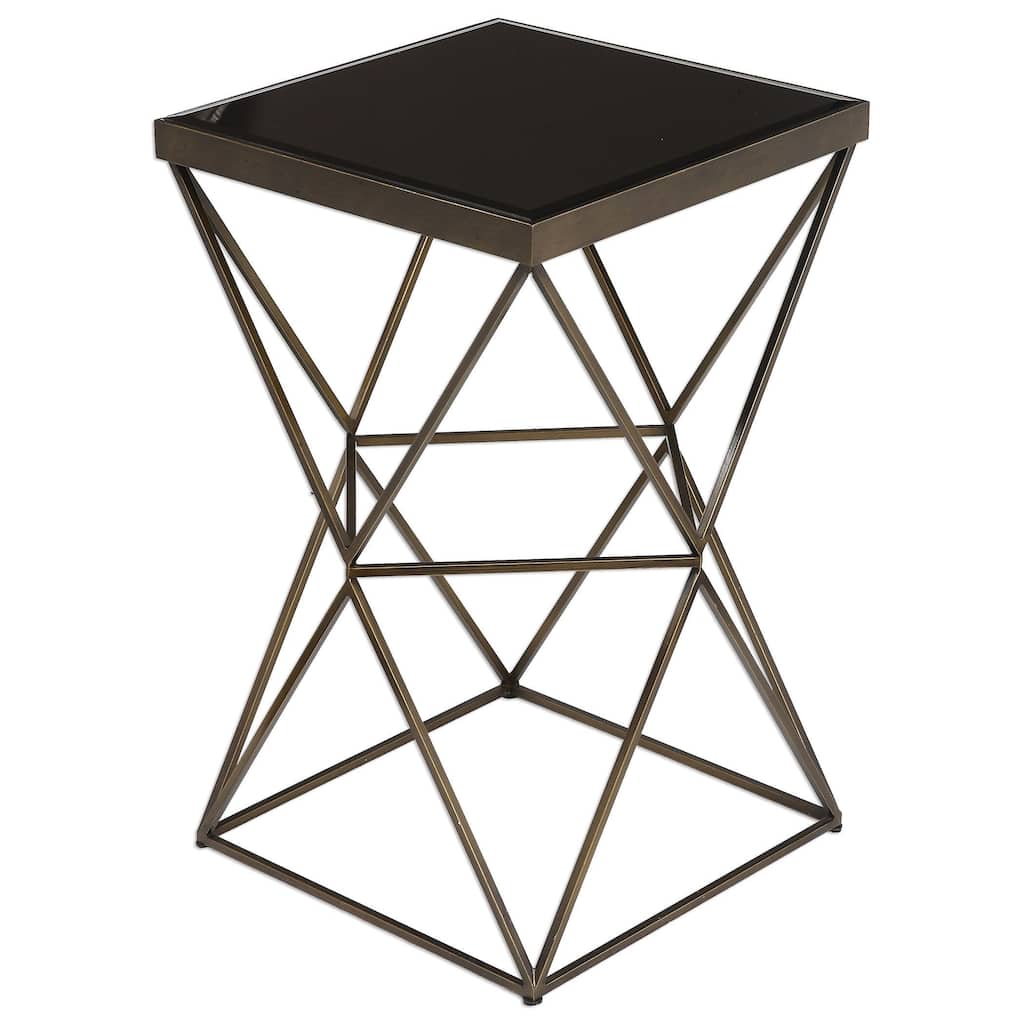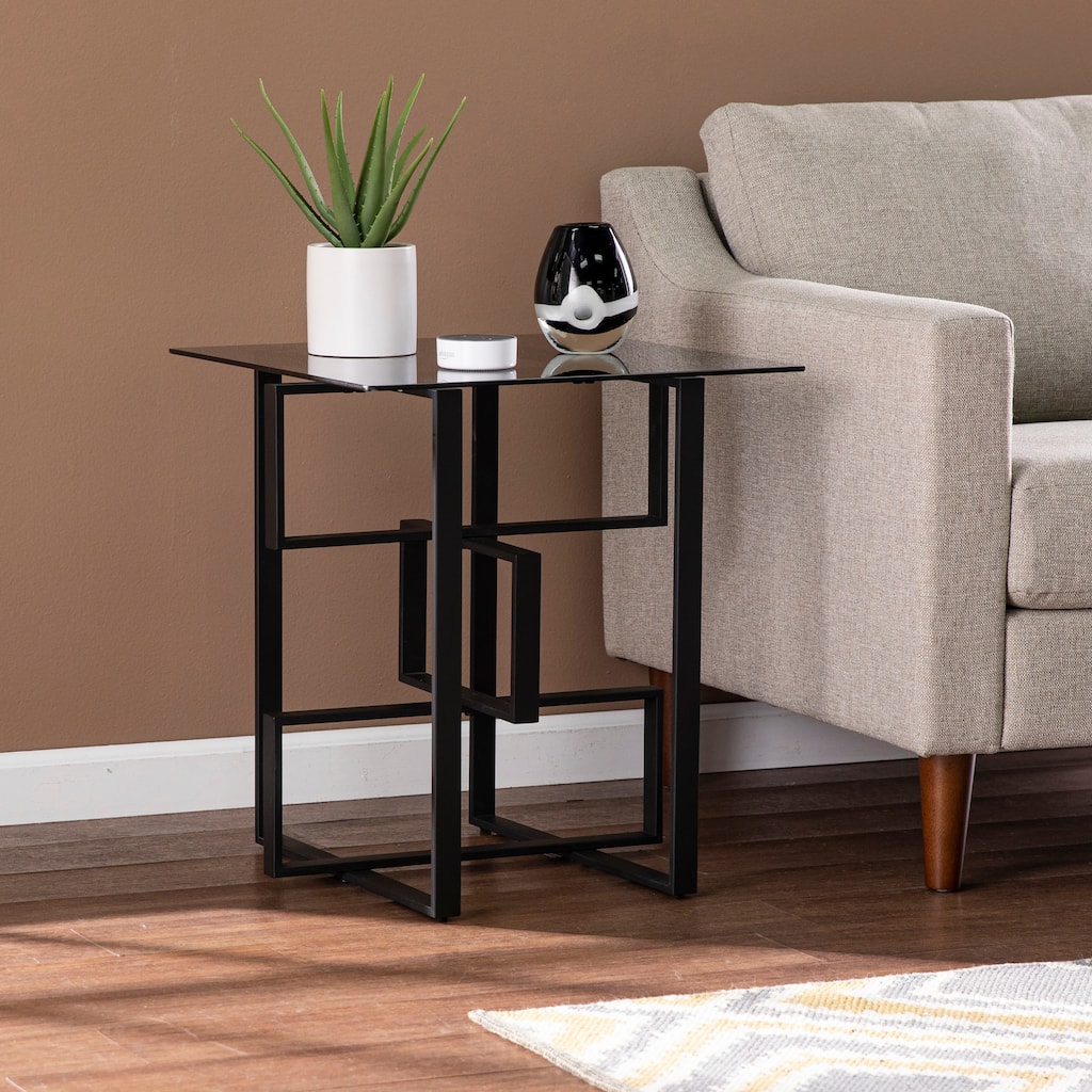 The black iron construction of this Auryon accent table is completed a with clear glass top, and antiqued mirror gallery shelf. A modern take on a contemporary design, this table will give your home living room a stylish flair.