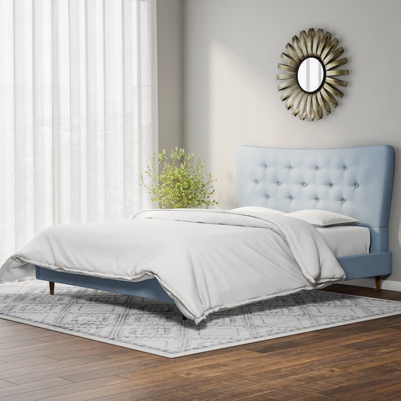 Elegantly and sculpturally designed, the Hermia Mid-century Modern Sky Blue Fabric Platform Bed features graceful curves with button-tufting detailing. Constructed of solid rubberwood and plywood frame, matching with walnut finishing solid rubberwood straight-tapering legs, the clean silhouette that define mid-century modern furniture, the Hermia will support a solid structure for your every night's sweet dream. Buttoned, padded headboard in a soft, tactile and durable fabric consisting of a mix of Linen, Polyester and Viscose provides a cozy appeal to the bed, allowing you to prop up and read while remaining stylish in its framing. The bed has a high quality build and benefits from a strong sprung slatted wooden base that acts as a flexible and supportive platform for your mattress. These curved slats adjust to your body`s movement, providing pressure sensitive support to keep your spine in good alignment and increase your comfort levels. To provide additional stability to the frame and mattress, a central rail and support leg offer extra support in the center. This prevents any tendency to roll together. The Hermia, featuring Scandinavian style and with gracefully curved look, will immensely modernize your bedroom. Made in Malaysia, the full, queen, or king size platform bed requires assembly.