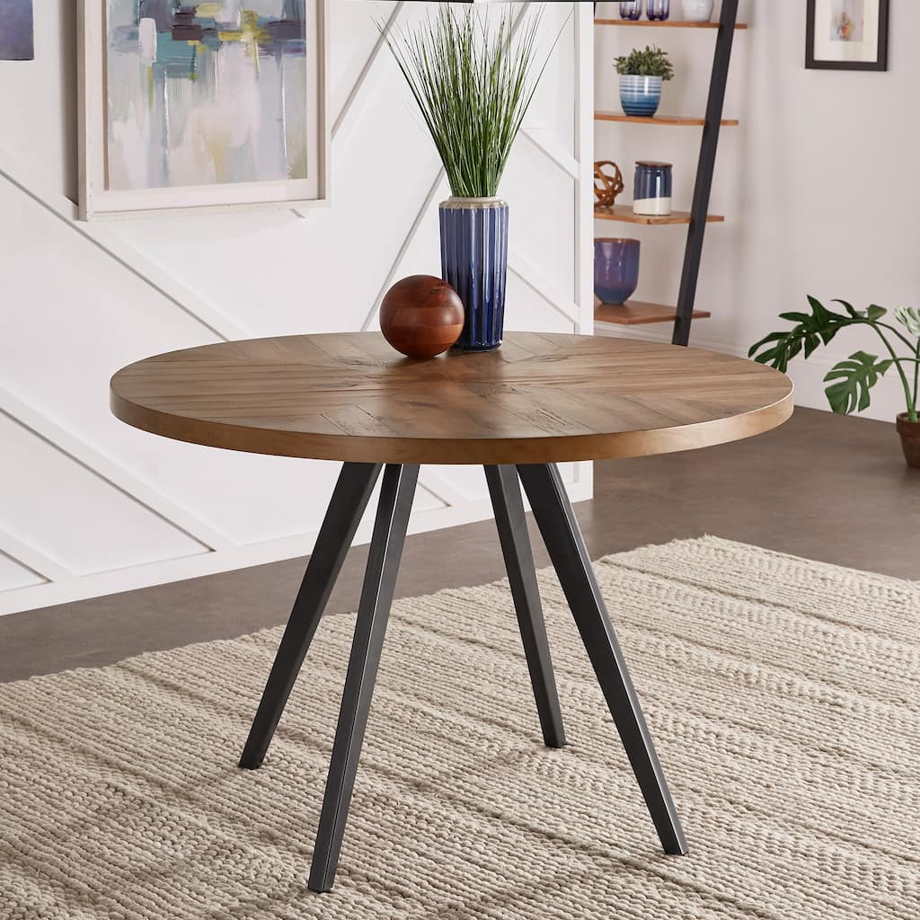 Elevate your dining space with this elegant mid-century modern round dining table. Crafted from rich, dark-stained wood, it features a smooth, circular tabletop that comfortably seats four to six people, making it perfect for intimate gatherings or everyday meals. The distinctive starburst-style base showcases sculptural legs with dynamic angles, offering both stability and visual flair.  Designed to blend timeless style with modern sophistication, this table is a standout piece for any kitchen or dining room. It complements a variety of interiors, from retro-inspired to contemporary. Product Dimensions: Overall: 45"W x 45"D x 29.5"H Weight: 44.97 LBS  Other Dimensions: Table Top: 45"W x 45"D x 0.75" thick; Table Base: 39.75"W x 39.75"D x 28.75"H.