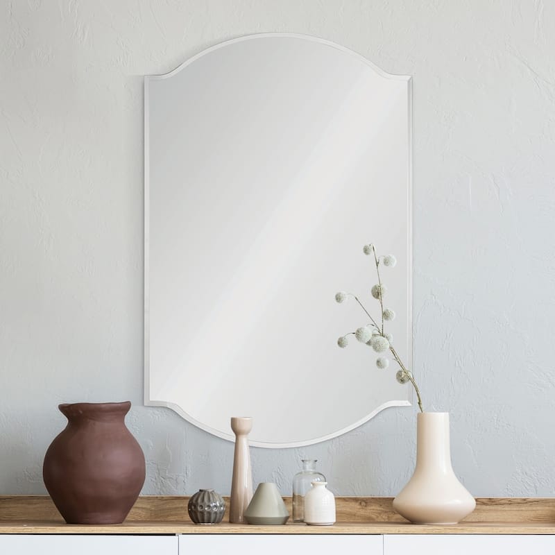 Grandeur and grace enter the traditional living room with this elegant mirror design. Hung vertically or horizontally, it captures and reflects the beauty of the interior. With its flowy all-glass design, it needs no additional details to make an impression.