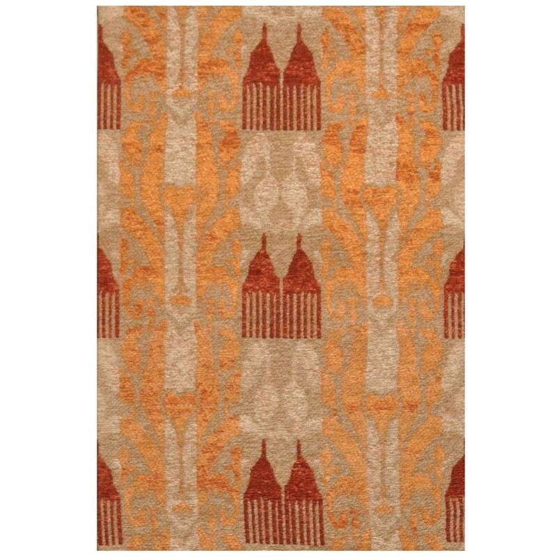 Enhance your living space with this unique, world art chenille flatweave rug. Made by village weavers in Bhadohi, India, this versatile rug is tightly woven with soft chenille fibers and features a knot count of 200 per square inch. The rug is made of 100% wool and comes in brown, beige, gold, and red colors. With a completely reversible design and soft white cotton fringe, this rug is suitable for both casual and formal settings. Plus, it's environmentally conscientious and made with all-natural fibers. Keep your rug looking new for years to come with annual professional cleaning.