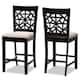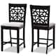 Set includes 2 counter height pub chairs Modern, contemporary style Materials: fabric polyester 100%, oak wood, foam Color: grey, espresso brown Constructed from oak wood Espresso brown finish Upholstered in polyester fabric and padded with foam Cut-out back design Includes: 2 pub stools Spot clean only