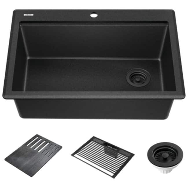 - Sink kit includes: sink, wood fiber cutting board, roll-up dish drying rack with removable utensil holder, silicone drying mat and matching drain assembly with strainer
